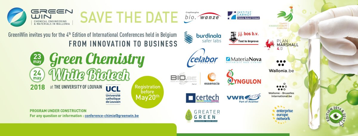 Thank you for your pre-registration to the GreenWin International Conferences “Green Chemistry and White Biotechnology: From Innovation to Business” which will be held next May 8th and 9th, 2019, in Gosselies, Belgium.